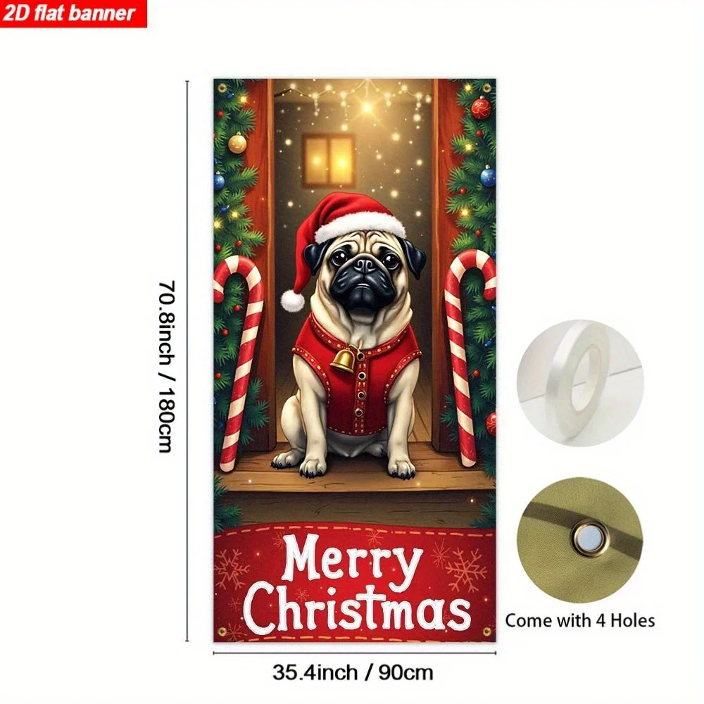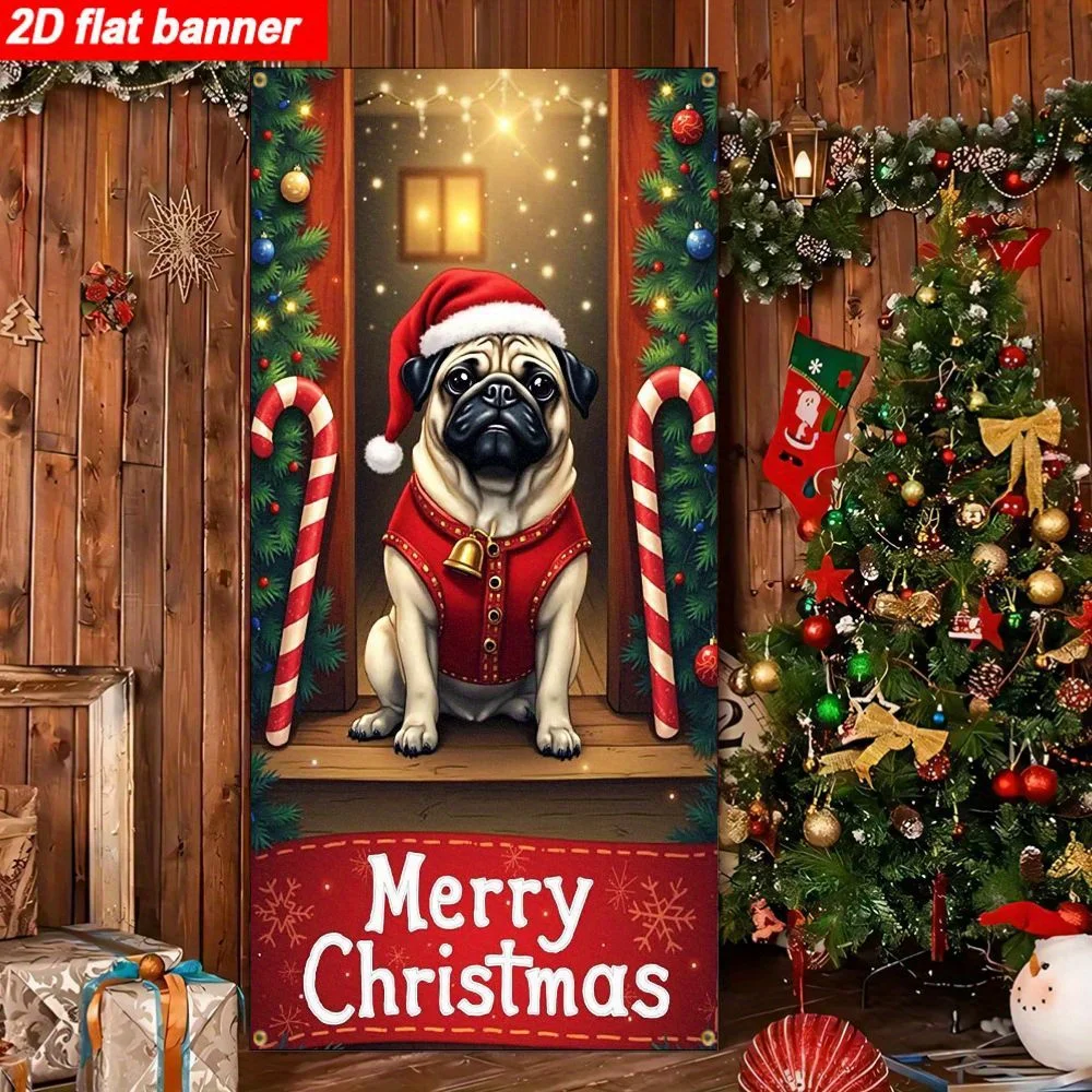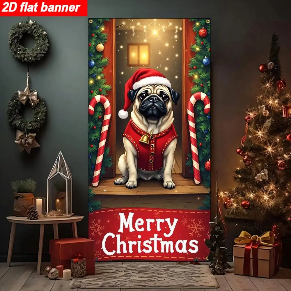 Christmas Pug Door Banner – 2D Flat Holiday Polyester Hanging Decor
