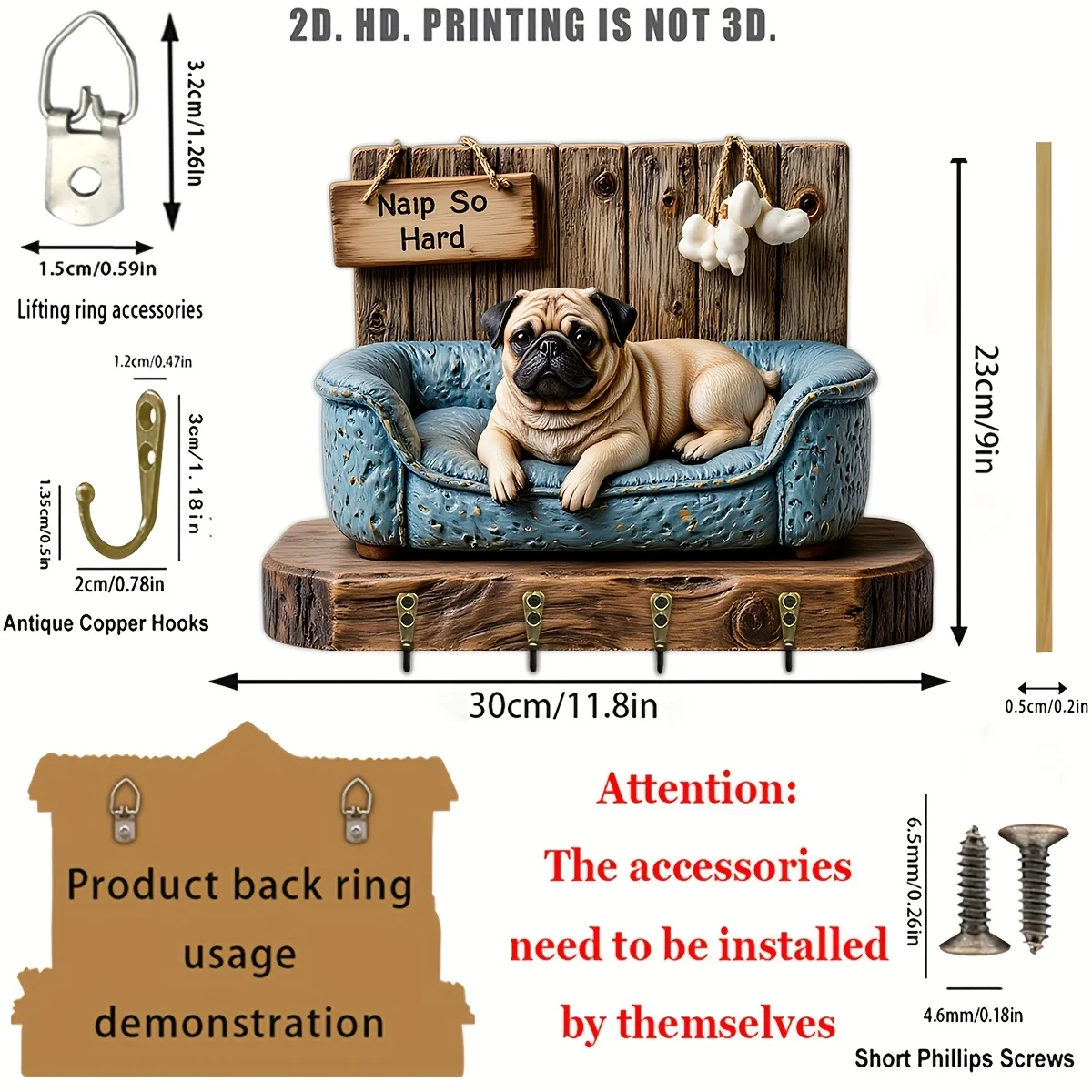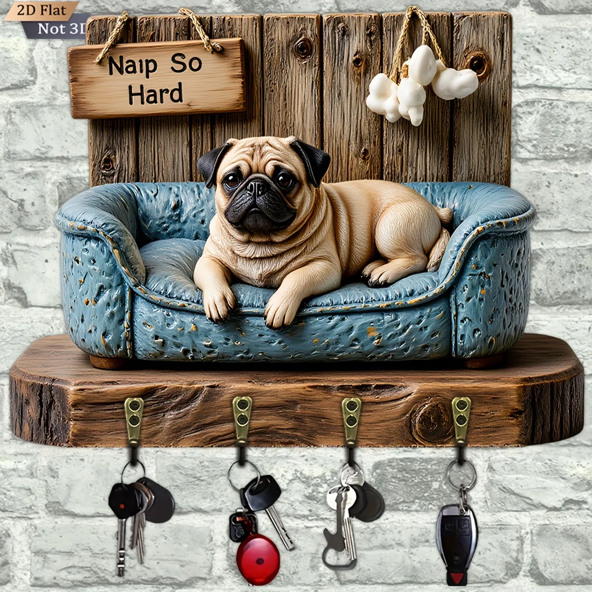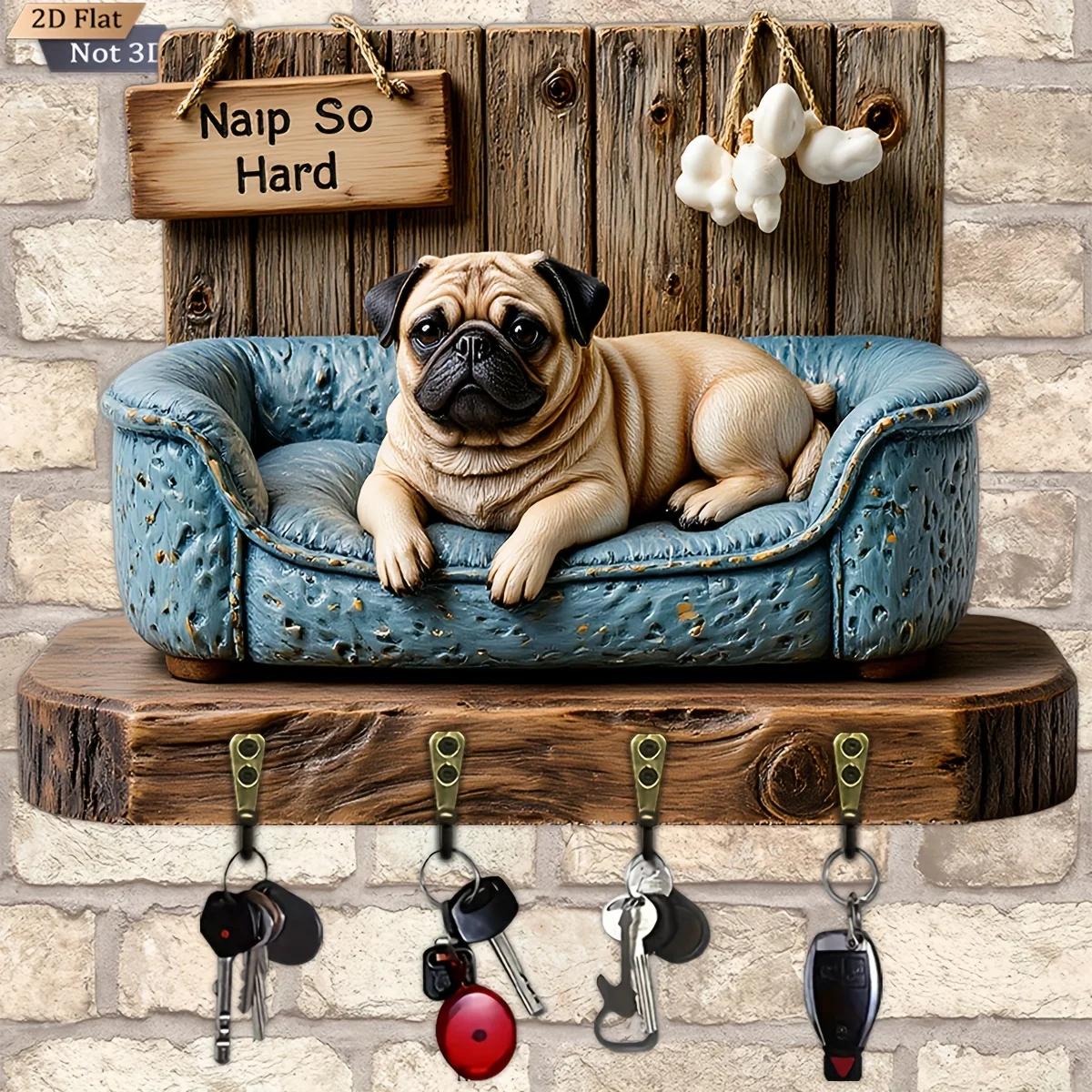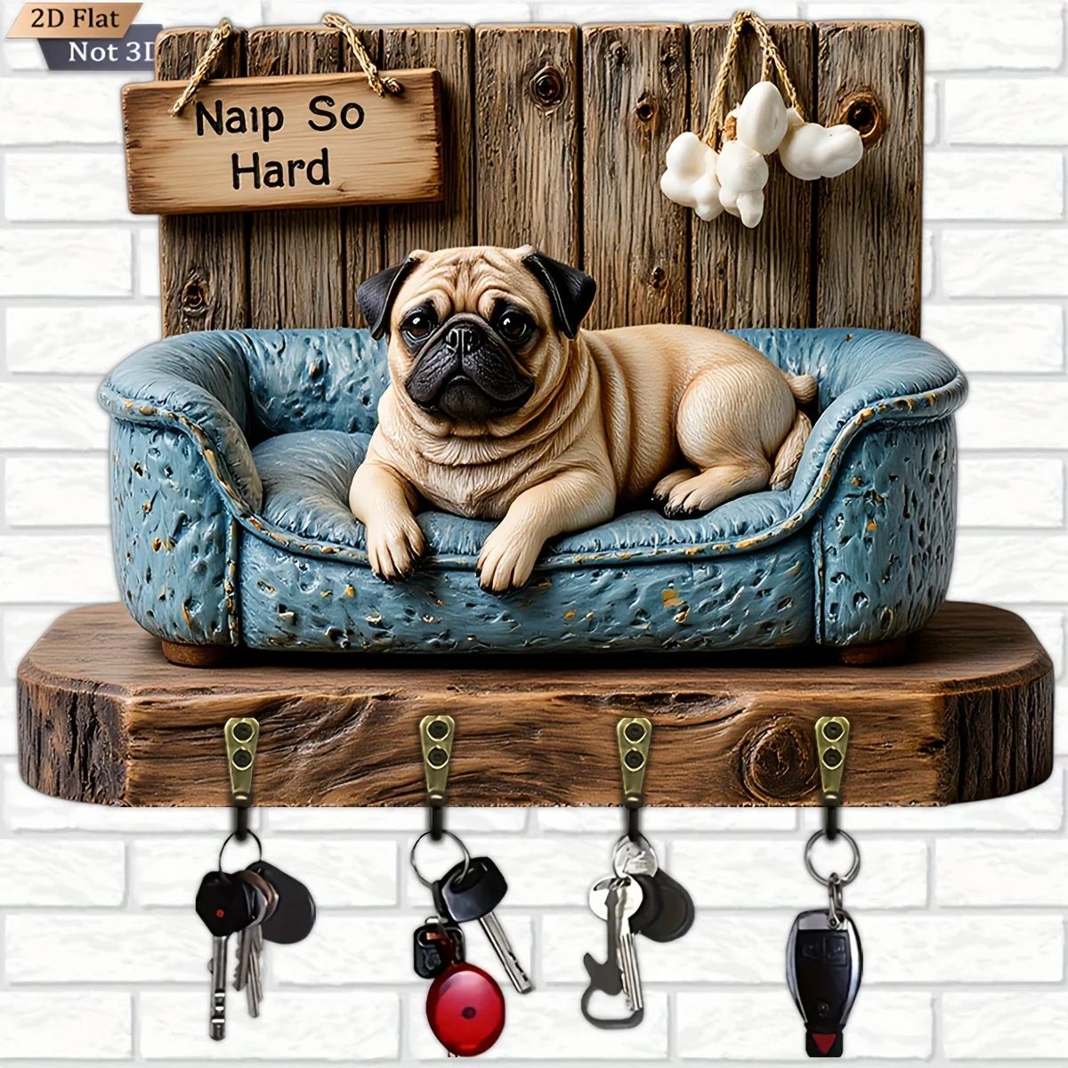 2D Flat, 1pc, Pug Sofa Shaped Key Hook Wooden Multifunctional Home Key Holder with Four Metal Hooks, Wall Decoration, Porch